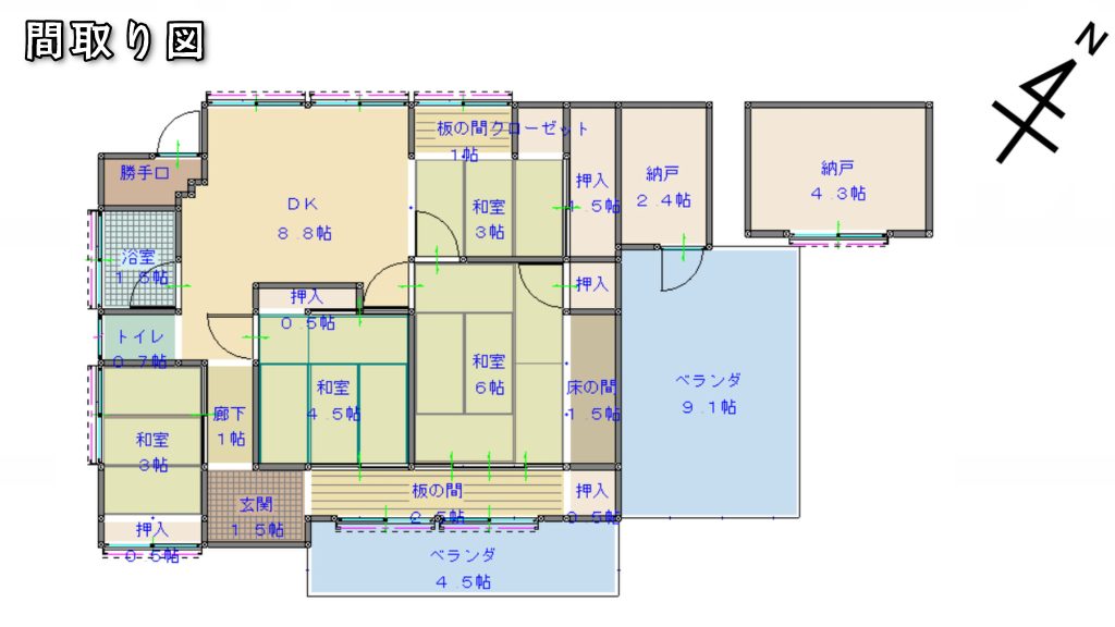 間取りは4DKと平屋としては広めで、2~3人世帯向けかと思います。