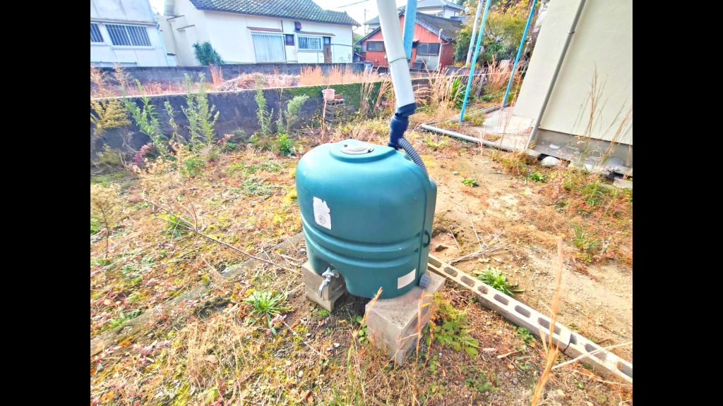家庭菜園用水を得るため、雨樋に接続された貯水タンク